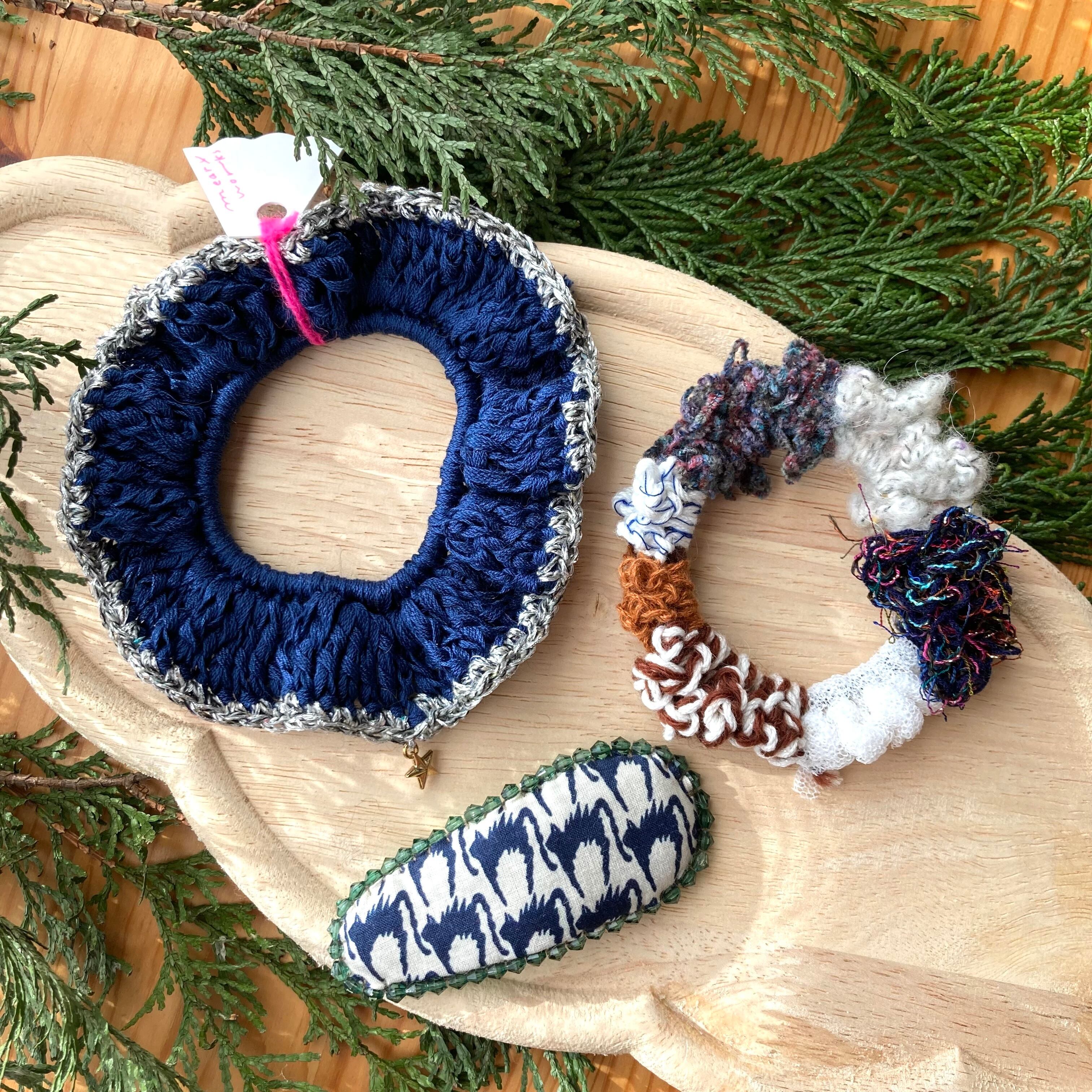 ニットのシュシュ2点、パッチンピン1点のセットです。