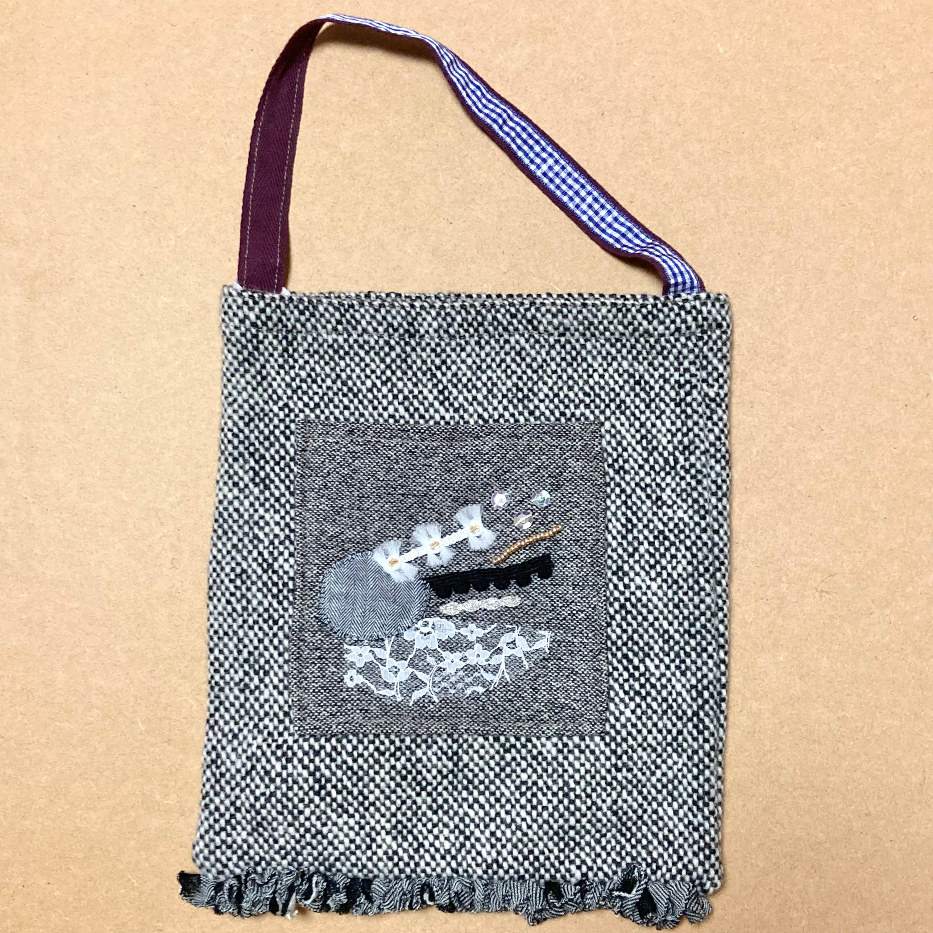 柔らかく肉厚なウール生地のトートバッグに彗星をイメージしたポケットと底にフリルをあしらいました。持ち手はラベンダーカラーの紐に青ギンガムチェックのリボンをそわせて1点もののバッグに仕立てました。縦26cm、幅23cm