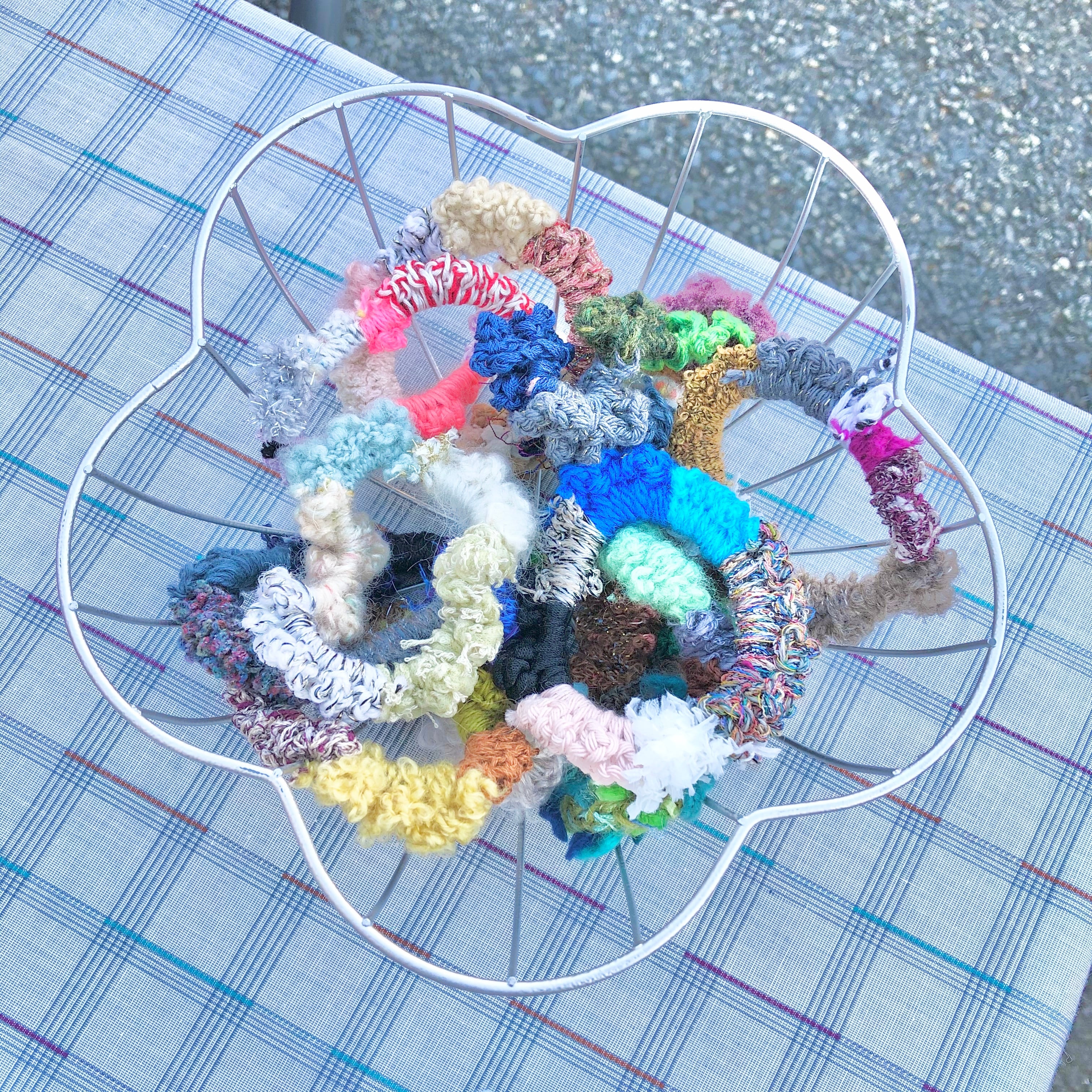 フリンジやドットなど、色々な珍しい糸を編み込みました。セーターの手首につけても、ほっこり可愛いです。
