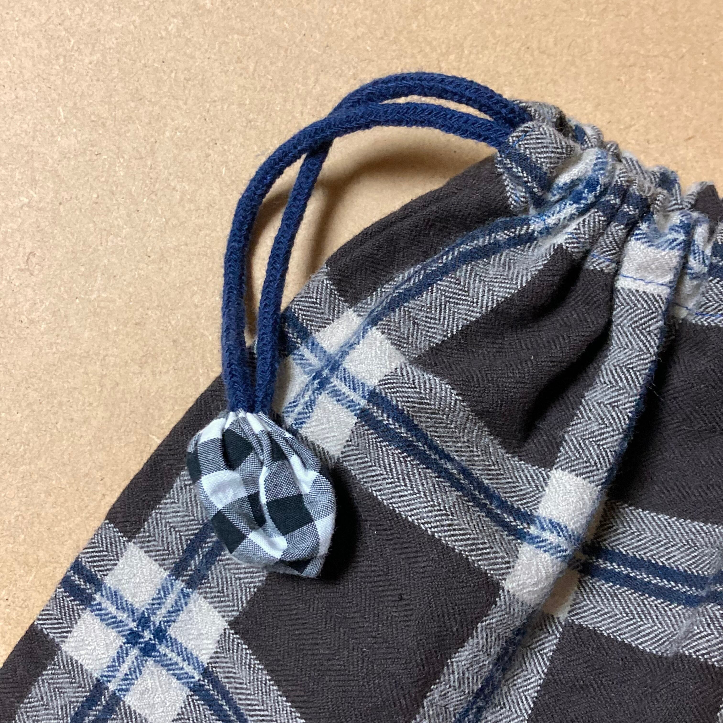 ウールのヘリンボーン織のチェックが可愛い生地でシンプルな巾着を作りました。紐先はギンガムチェックのぽわんと膨らむ蕾のような飾りつきです。