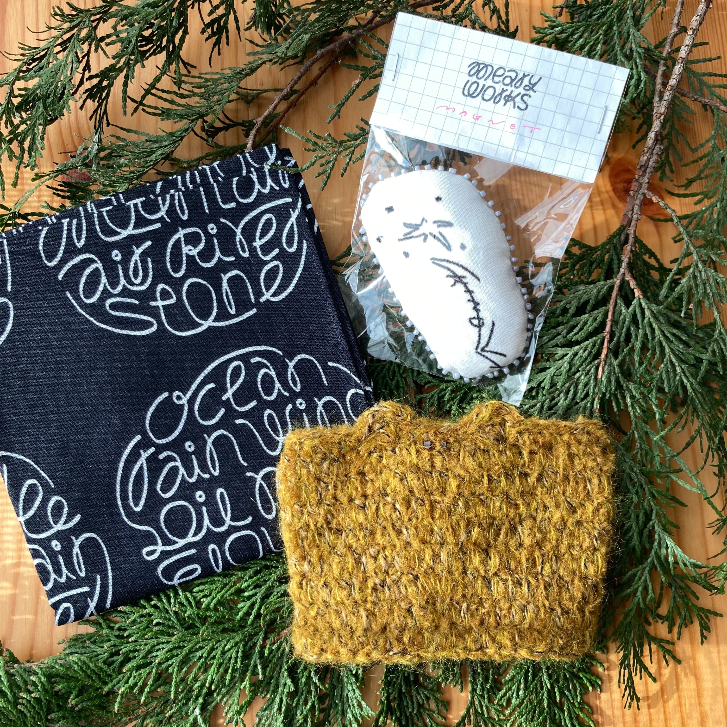 バンダナ、カップカバー、マグネットの3点セットです。