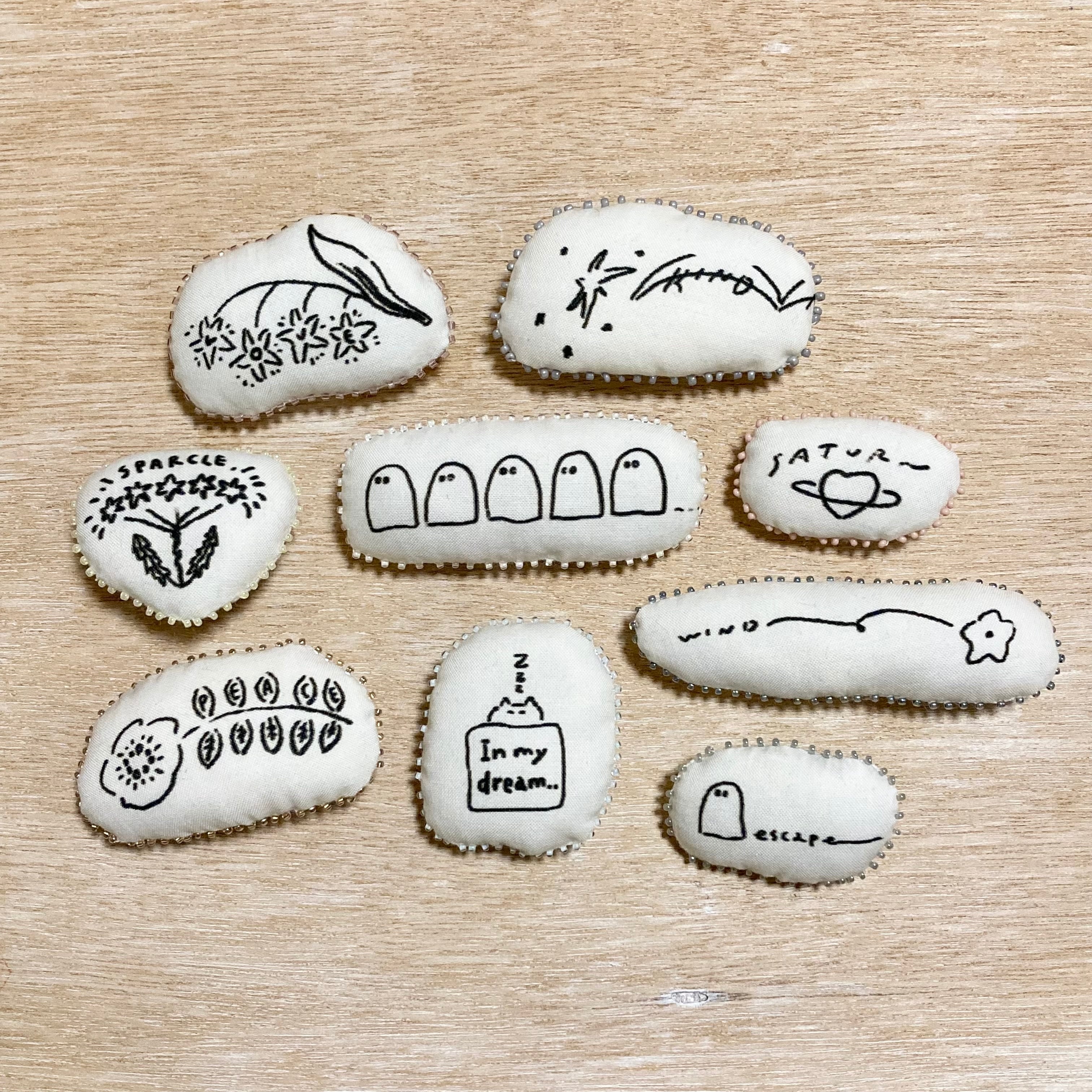 手描きの柄「夢で逢えたら」から流れ星のモチーフを切り取って、綿入りのマグネットにしました。「kind」の文字がシューと流れるお星さまです。