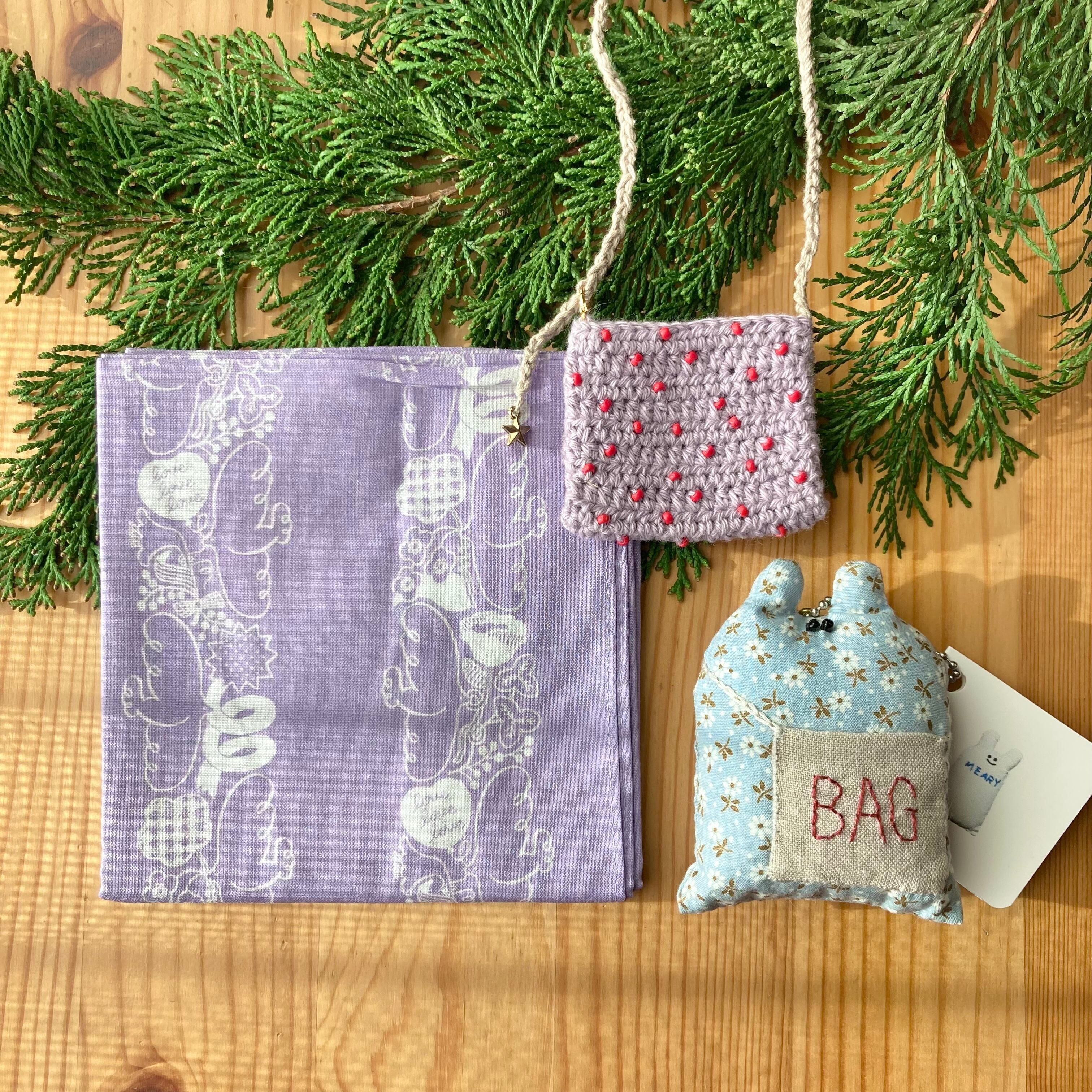 ぬいぐるみ、バンダナ、お守り袋の3点セットです。