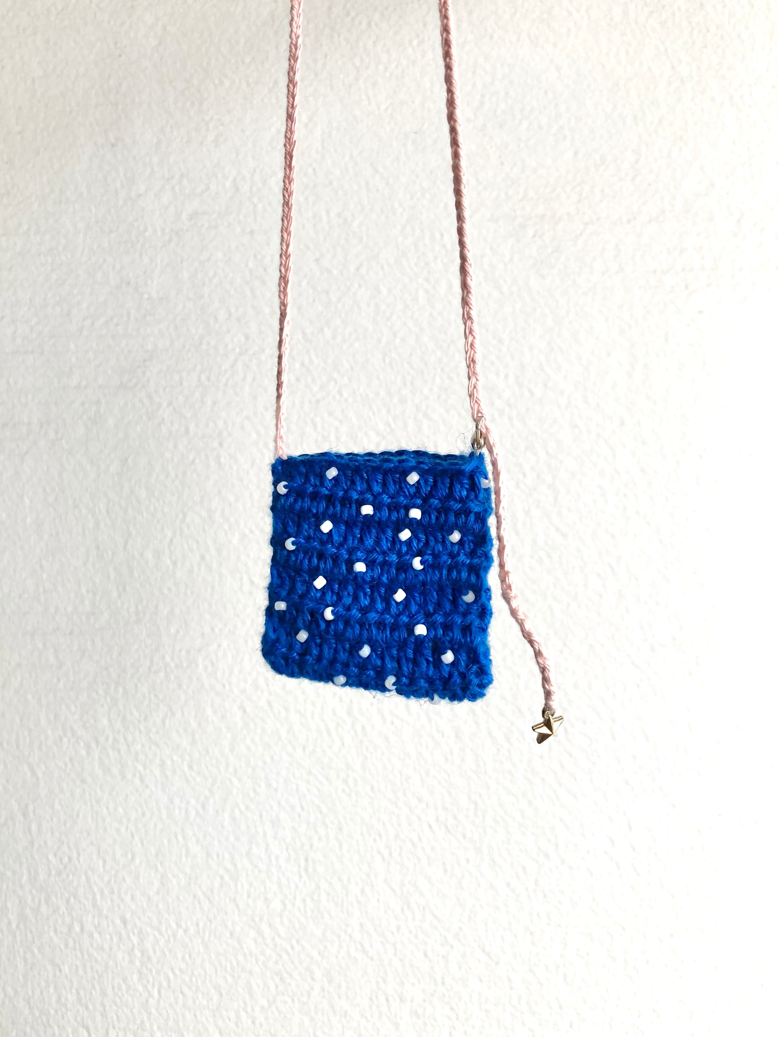 お守り袋です。天然石や好きな香り、ちょっとした装身具などを入れて身につけられます。小さなポシェットのように首から下げられるデザインにしました。