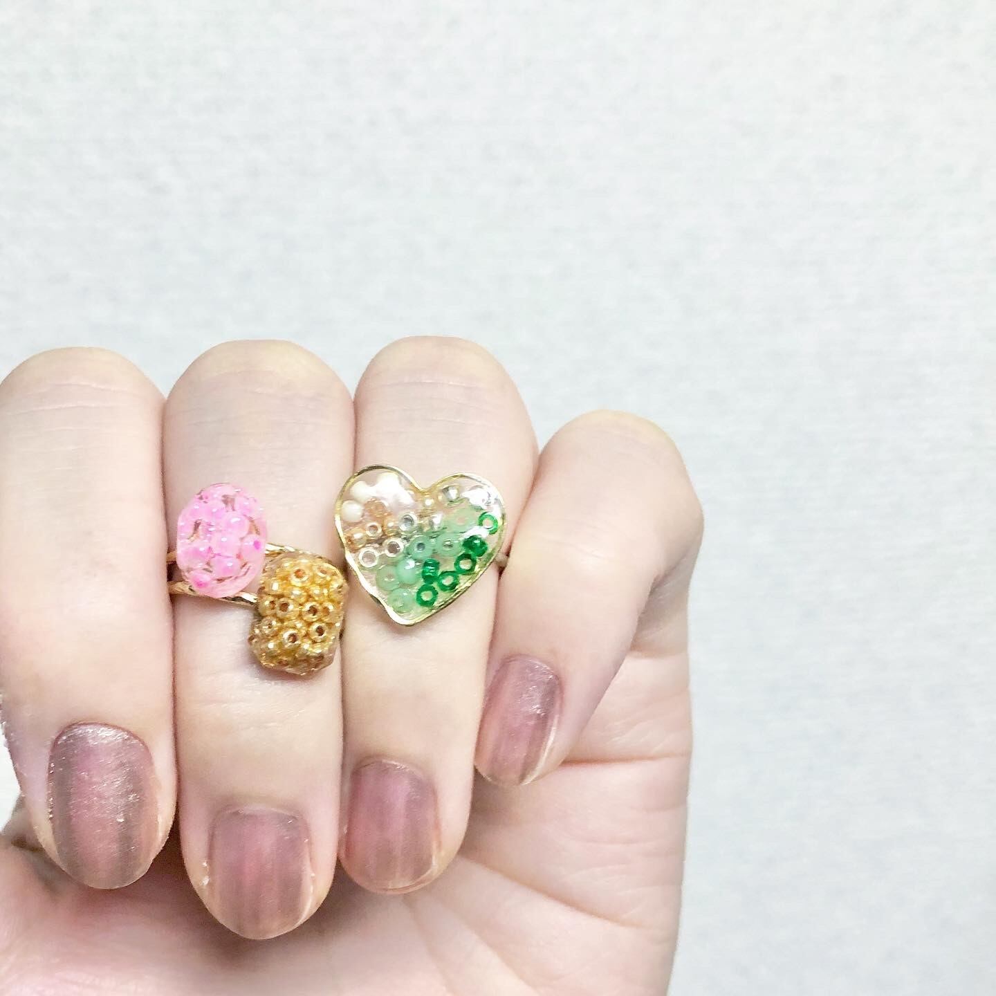 金色のビーズをギュッと詰めた宝石チックなゆびわです。