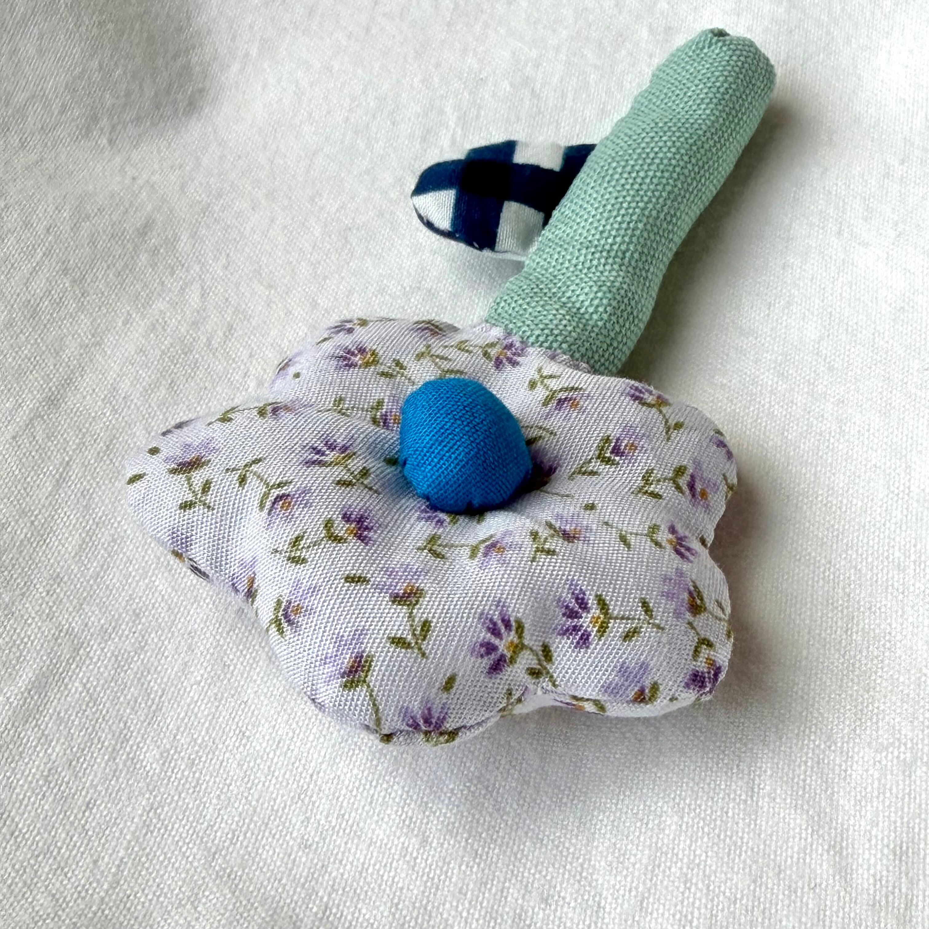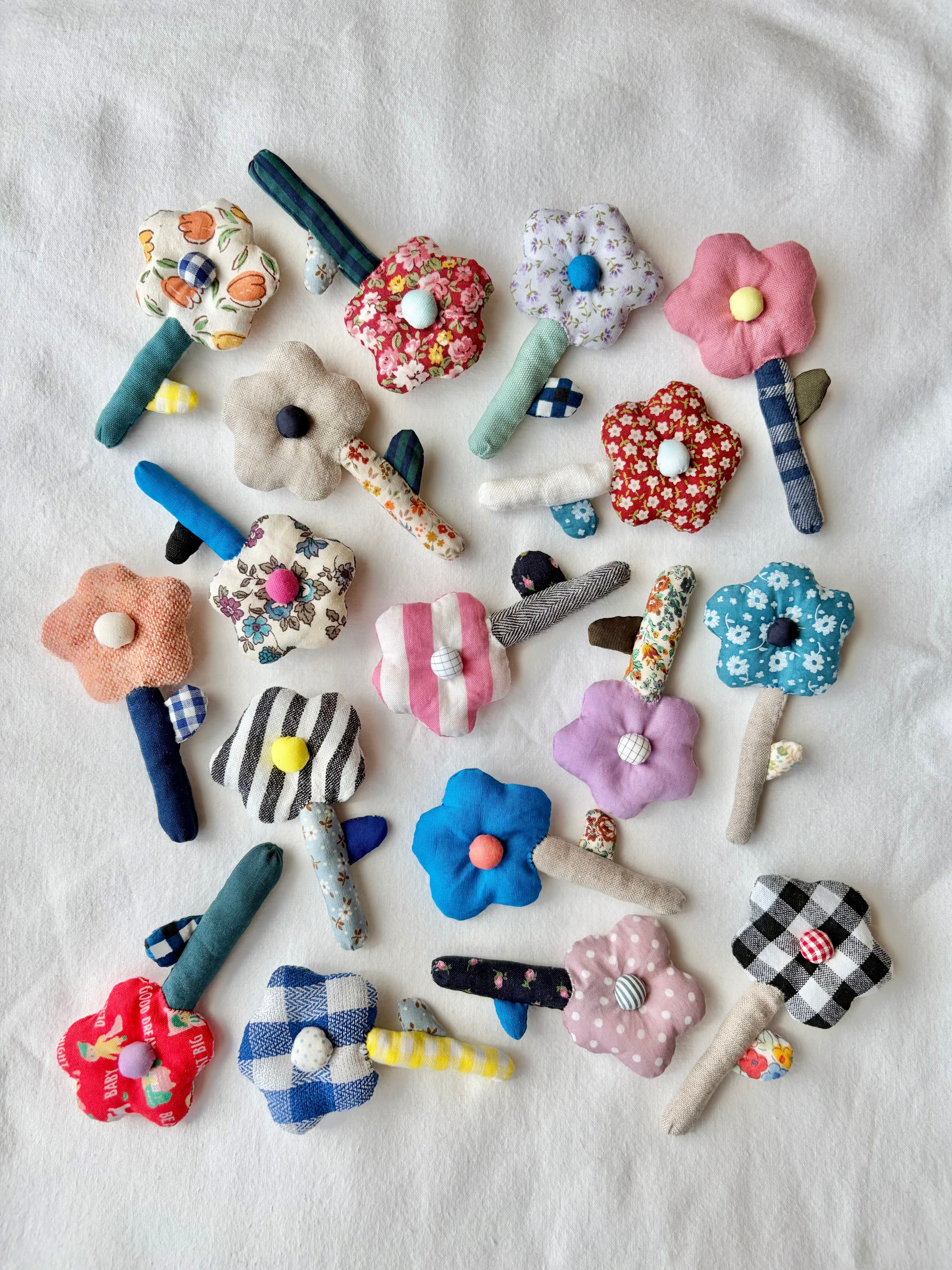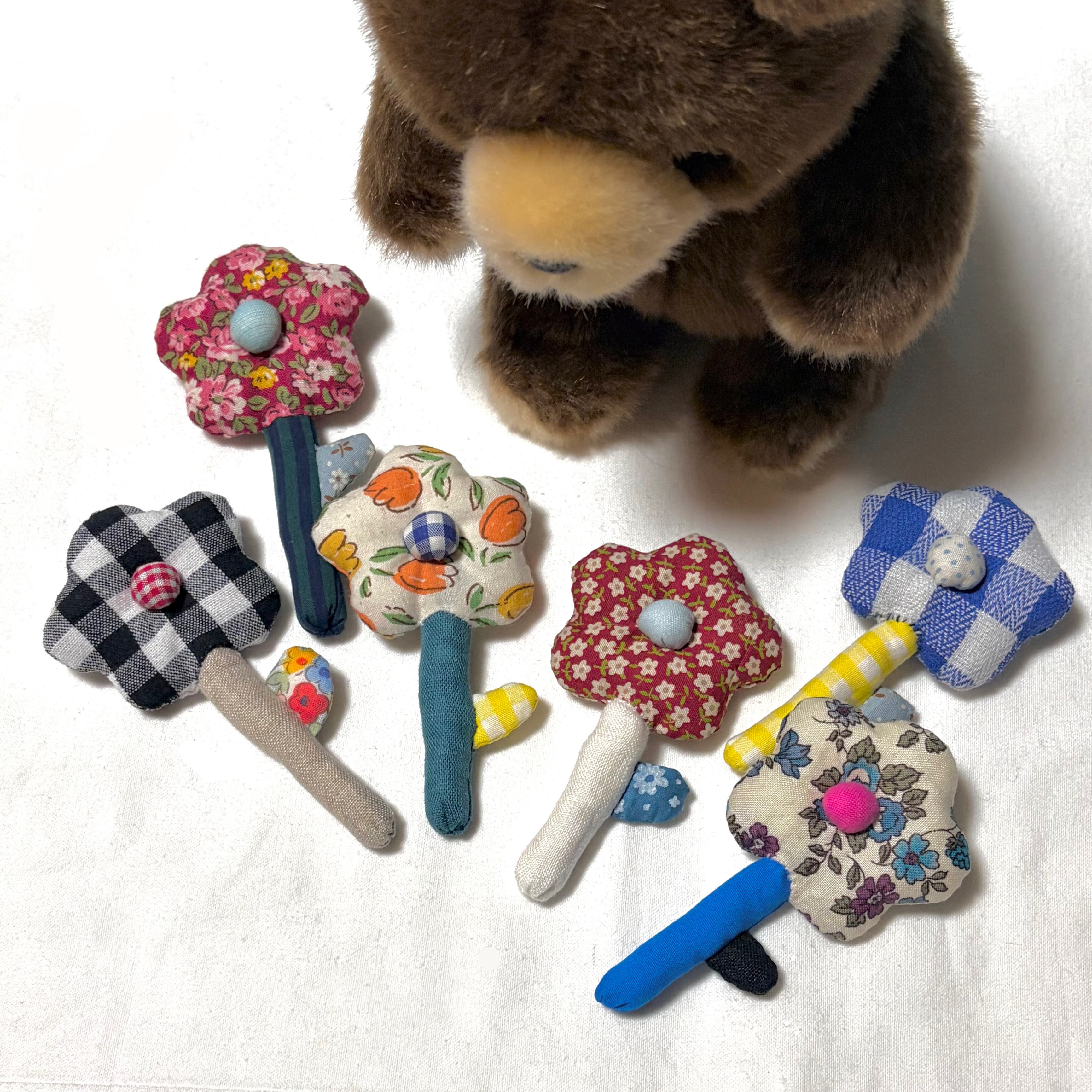 色んな生地を組み合わせ、世界にひとつだけのお花のブローチを作りました。